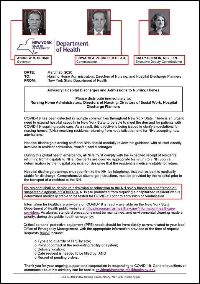 Way back in May we reported that New York’s Governor Andrew Cuomo, Health Commissioner Howard Zucker, MD and Executive Deputy Commissioner Sally Dreslin’s actions led to thousands of deaths in New York state.