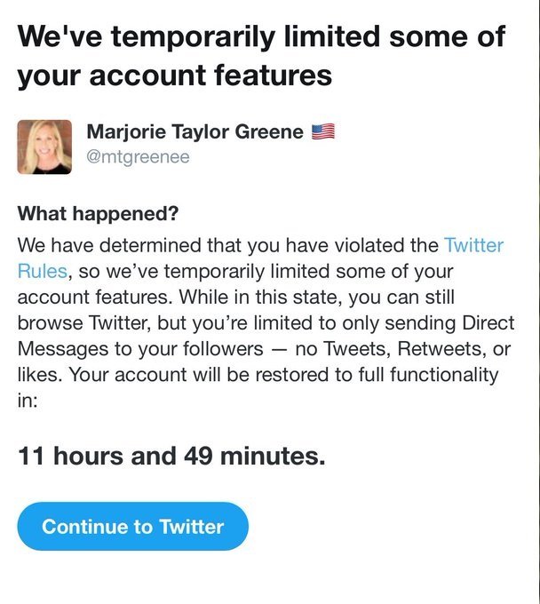 ‘Twitter has locked Rep. Marjorie Taylor Greene out of her Twitter account on the day that Democrats are introducing a resolution to overturn the will of voters and expel her from Congress.