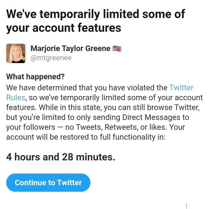 A spokesperson for Greene confirmed that she is locked out of the account for 12 hours for unspecified “repeated violations.”