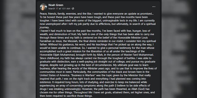 The deceased suspect, Noah Green, included photos and videos of Nation of Islam rallies on his Facebook page. He also identified himself as a Follower of Farrakhan on his Facebook page.