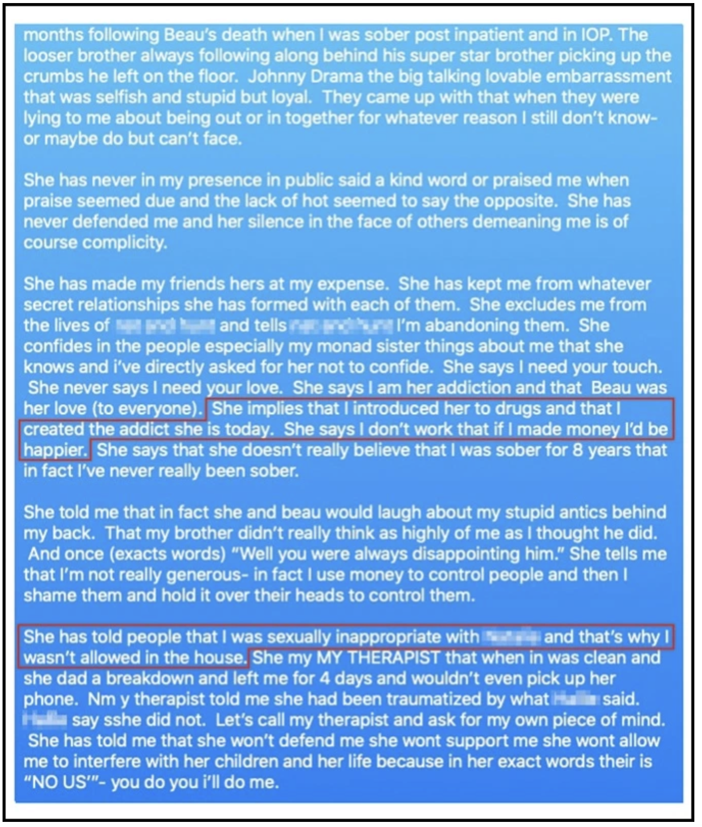 The person claims Hunter got her hooked on drugs and then Hunter says: “She has told people that I was sexually inappropriate with xxxx and that’s why I wasn’t allowed in the house.”