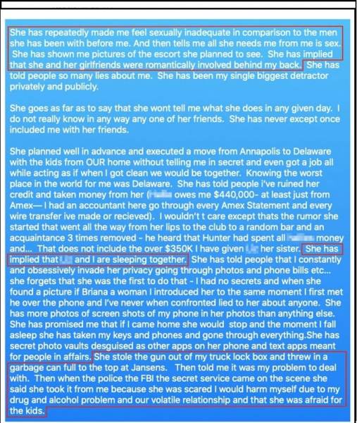 Next, Hunter comes across as borderline crazy. He claims this woman only wanted him for sex and yet she was sexually involved with escorts and her girlfriends. Hunter says this woman owes him over $400,000 and then declares this woman implied that Hunter and another certain person were sleeping together.Then Hunter says that the woman threw his gun away and the police, FBI and Secret Service got involved. The woman claimed she did this because she was afraid Hunter would harm himself or the KIDS.
