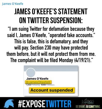 [WESTCHESTER, NY – Apr. 19, 2021] Project Veritas founder and CEO James O’Keefe sued Twitter in The Supreme Court of New York today, over “false and defamatory” statements made by the Big Tech giant.