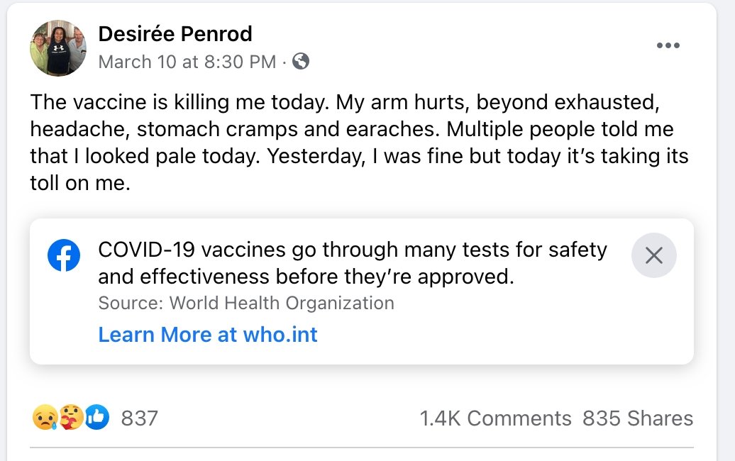 ’25-year-old pre-school teacher Desiree Penrod took the Covid vaccine in early March. She then posted on Facebook that “The vaccine is killing me” describing her adverse reaction to the coronavirus vaccine. Facebook flagged the post as fake news.’
