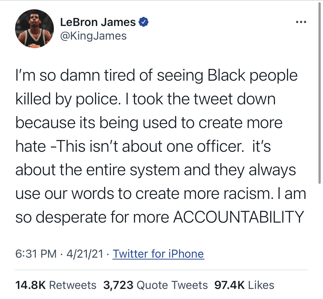 Could you imagine being this unaware of your own guilt? For the record, this is the tweet that Labron insinuated white people were using to gin up more hate …