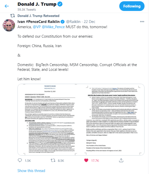 With Pence having just 4 hours left to follow the law, President Donald Trump retweeted the memo to persuade the Vice President to stay true to the oath he took when he was sworn in.