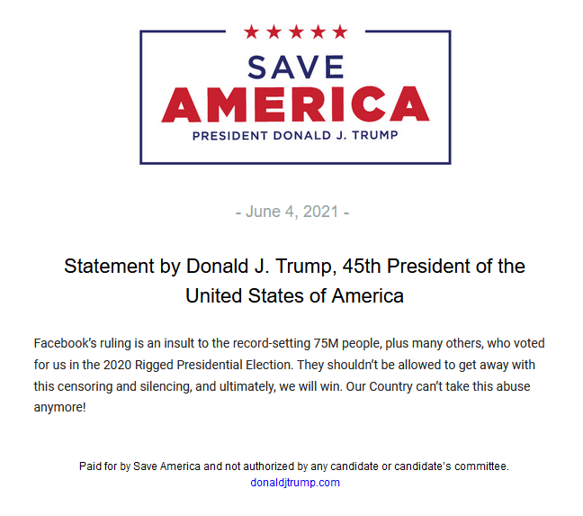 President Trump issued two responses, first writing that, “Facebook’s ruling is an insult to the record-setting 75M people, plus many others, who voted for us in the 2020 Rigged Presidential Election.