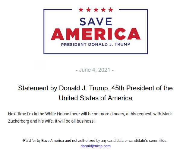 President Trump wrote, “Next time I’m in the White House there will be no more dinners, at his request, with Mark Zuckerberg and his wife. It will be all business!”