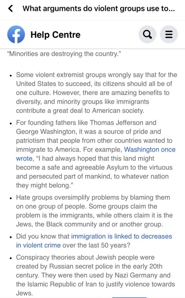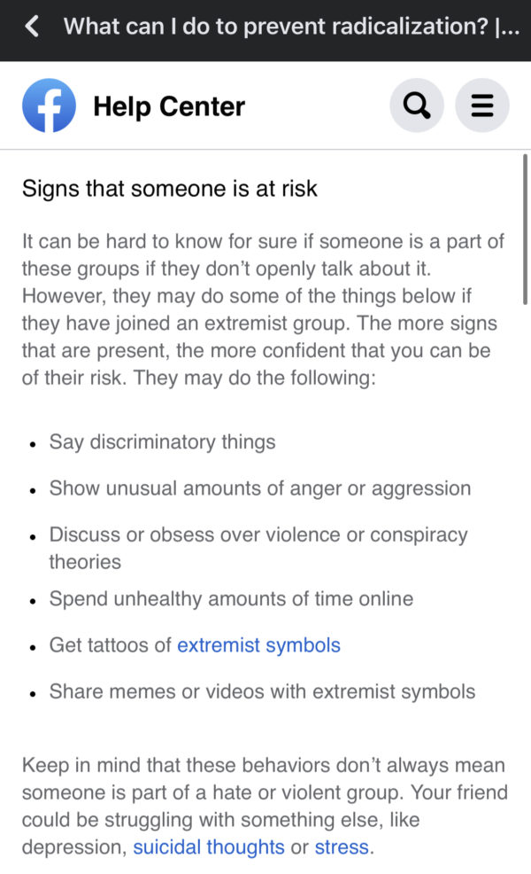 The tech giant added signs that someone may be at risk to be an extremist, including “unusual amounts of anger or aggression” and “spending unhealthy amounts of time online.” There was a small disclaimer at the bottom that these behaviors may be indicative of someone struggling with depression, suicidal thoughts, or stress