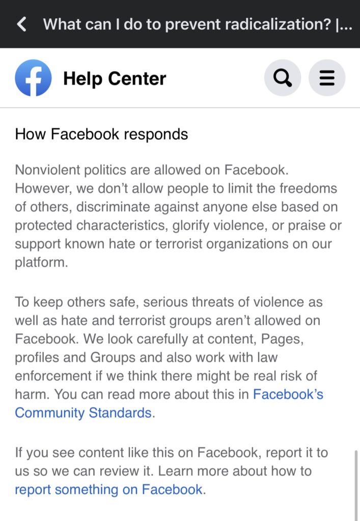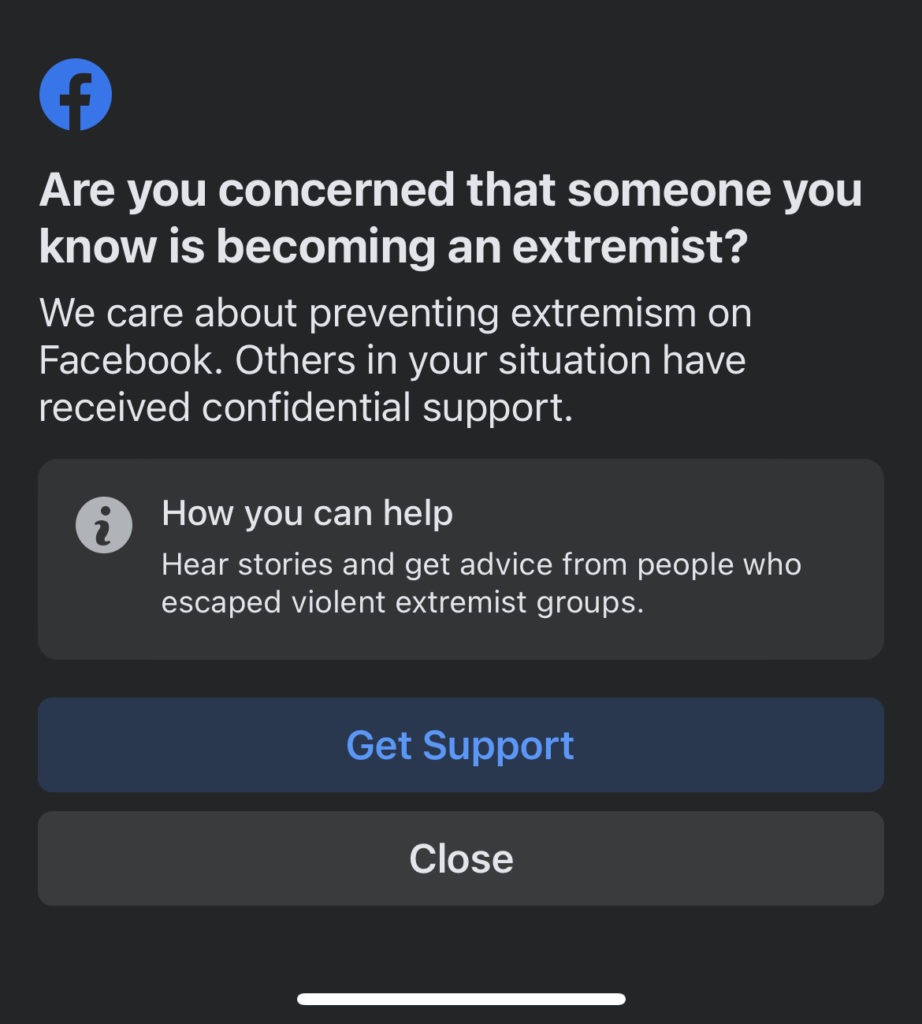 This pop-up will appear when you first log in to Facebook, letting members know that Facebook cares about “preventing extremism” on their platform. It lures members in with letting them know that “others in your situation have received confidential support.”