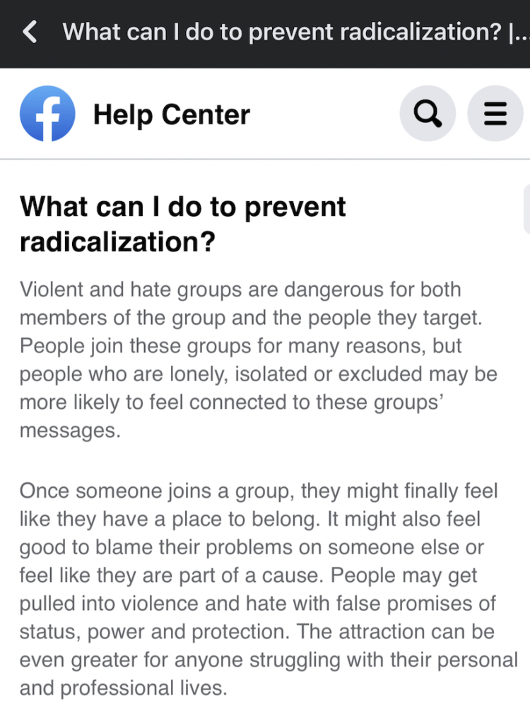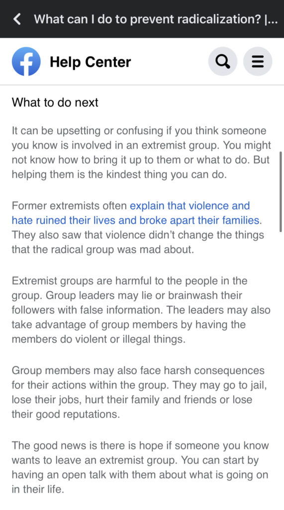 Facebook has recently included a deradicalization program into their latest update, reaching out to its members so they can “get advice from people who escaped violent extremist groups.”