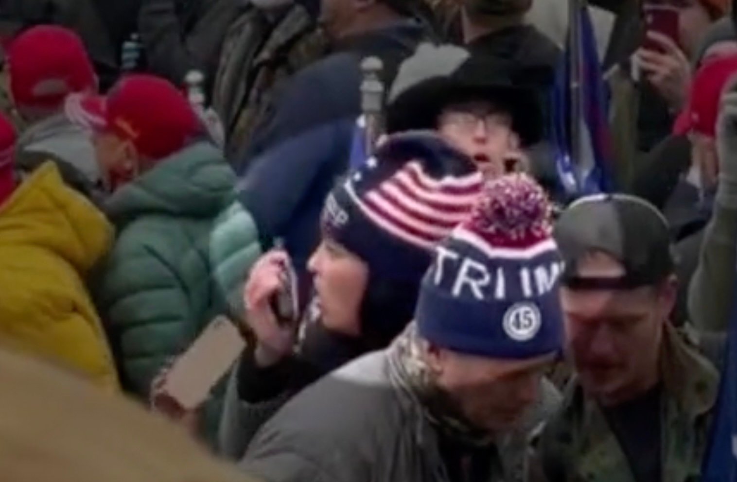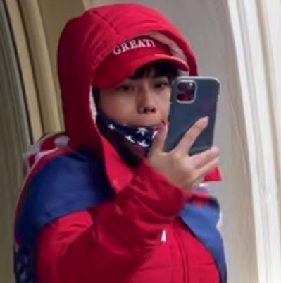 In this video, a black-hooded man carries an Asian woman dressed in red, with a red hood, a US flag scarf, and a MAGA hat, onto the window sill on the west side of the Capitol Building.