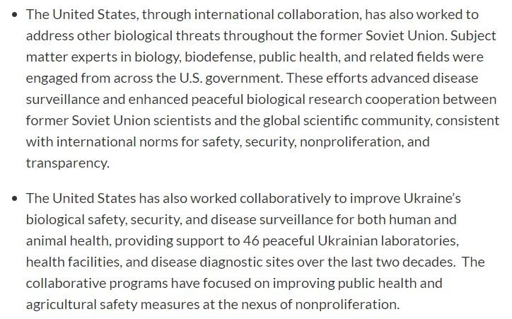 The United States has also worked collaboratively to improve Ukraine’s biological safety, security, and disease surveillance for both human and animal health, providing support to 46 peaceful Ukrainian laboratories, health facilities, and disease diagnostic sites over the last two decades. The collaborative programs have focused on improving public health and agricultural safety measures at the nexus of nonproliferation.