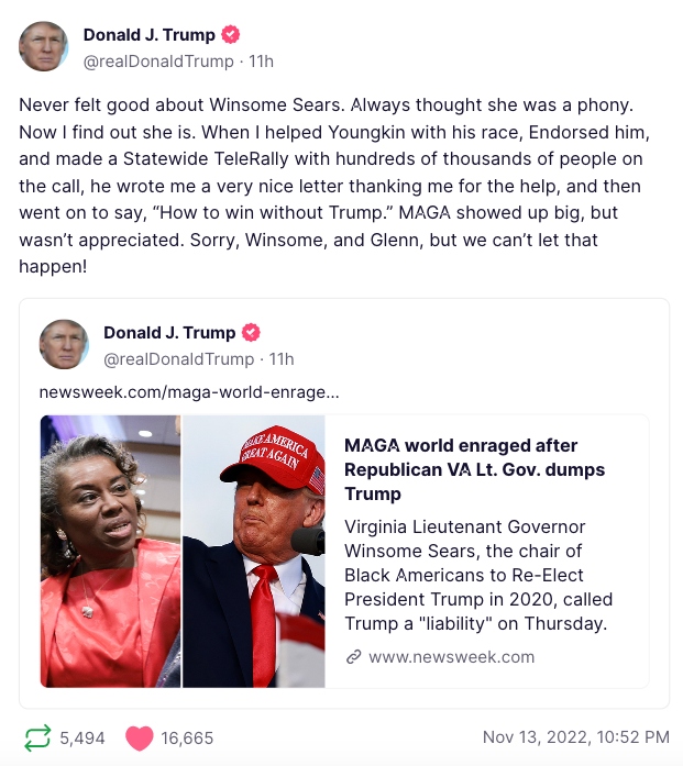 “Never felt good about Winsome Sears. Always thought she was a phony. Now I find out she is,” President Trump wrote in a post linking to a Newsweek article titled “MAGA world enraged after Republican VA Lt. Gov. dumps Trump.”