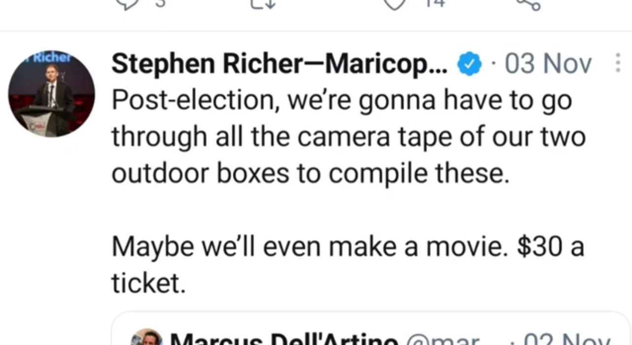 Maricopa County Recorder Stephen Richer posted a snarky tweet on November 3, joking about going through the footage of ballot traffickers and making fun of the 2000 Mules documentary.