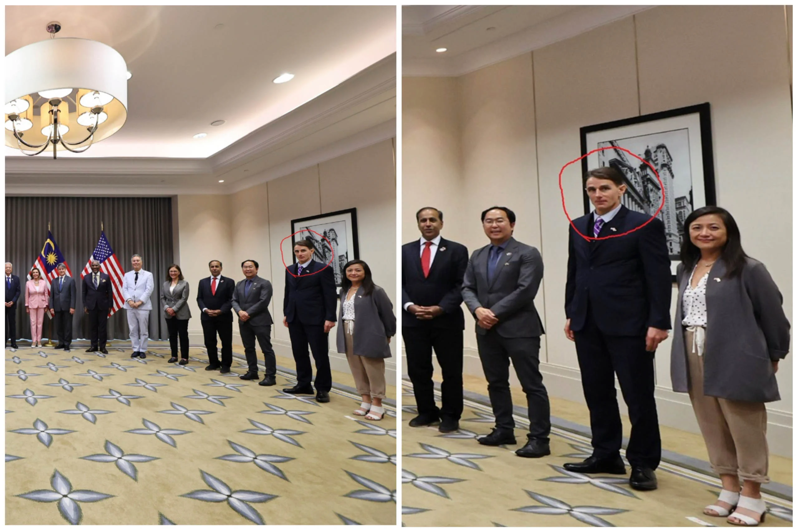 The two photographs below originated from a source in Taiwan. The circled man in the photo on the left is the same man labeled as Paul Pelosi Jr., Nancy Pelosi’s son, in the photograph on the right. That man is clearly part of Nancy Pelosi’s inner entourage, but, strangely, he does not appear in any other photographs circulating on the internet.